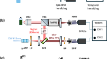 To test, we use a QD-micropillar device11 featuring a quality factor of 9350 and a low cavity reflectivity of 0.015. It is kept in a closed-cycle cryostat and the QD’s neutral exciton is temperature-tuned into the cavity resonance at 13.6 K, emitting at 911.54 nm. The setup is schematically shown in Fig. 1b. We use a confocal microscope setup equipped with a tunable continuous-wave (CW) laser of 100 kHz linewidth as the excitation source and an optical circulator made of a polarising beam splitter and a quarter-wave plate for collecting the RF in the same polarisation of the driving laser11,27. The QD is characterised to have a Purcell enhanced lifetime of T1 = 67.2 ps (Fp ≃ 10), corresponding to a natural linewidth of γ∥/2π = 2.37 GHz, which is 15 times narrower than the cavity mode (κ/2π = 35 GHz). The RF is fed into a custom-built AMZI with a fixed delay of τ = 4.92 ns for interference before detection by single photon detectors. With additional apparatuses, the whole setup allows characterisations of high-resolution spectroscopy, auto-correlation function g(2)(Δt), the first-order correlation function g(1)(τ), and two-photon interference. All excitation fluxes used were strictly calibrated via the incident optical power (Pin) upon the sample surface using the relation of \(\bar{n}={P}_{in}{T}_{1}/h\nu\). Detailed description of the experimental setup can be found in “Methods”.