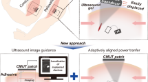 Ultrasound is a widely used medical imaging modality, providing non-invasive and safe real-time imaging of deep-lying tissues, organs, and blood flow1,2,3. Compared to X-ray, computed tomography (CT), and magnetic resonance imaging (MRI), ultrasound machines are relatively compact and inexpensive3,4,5. Recent advancements in wearable devices and technology have led to the development of wearable ultrasonic transducer arrays1,4,6,7,8,9,10,11,12,13,14,15, which enable various applications, including monitoring blood flow in different body regions, imaging cardiovascular structures, and mapping tissue moduli.