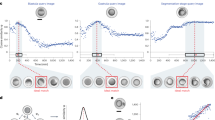 Beyond embryo-to-embryo differences in cycle duration, alignment of different image sequences is further limited by the 1-minute resolution of time-lapse imaging, which can result in sub-minute time offsets between sequences. This offset is particularly critical in nc11, as its short duration means that even small timing differences can significantly impact nuclear morphology. To improve the accuracy of nc11 dataset labeling, we tried to extract additional temporal information from the first frame of nc11 in each image sequence. During this 1-minute interval, dividing nuclei undergo significant elongation, with the axial ratio changing systematically over time. By comparing the median nuclear axial ratio (\(\tilde{\varepsilon }\); major vs. minor axes) measured for each embryo, we classified all embryos into two groups with \(\tilde{\varepsilon }\) around 1.36 and 1.67, respectively (Supplementary Fig. 1b). Using higher temporal resolution imaging (12 fpm) of nuclear division, we estimated the time offset between these two groups to be ~25 s (~0.4 min, Supplementary Fig. 1c). Consequently, nc11 time labels were adjusted to 0.6–6.6 min and 1–7 min for the two groups of embryos, accordingly.