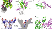 MPC proteins belong to the recently identified family of transporters known as triple-helix-bundle (THB) transporters. These transporters use a single THB as their basic subunit and require two THBs to form a functional unit27. THB transporters are further categorized into two subgroups: subgroup-1 transporters contain a single THB per protomer and function as dimers, such as MPC and the bacterial SemiSWEET transporter, a homodimer that facilitates sugar transport across bacterial cell membranes28,29,30,31,32 (Supplementary Fig. 5a–c); subgroup-2 transporters feature two THBs linked by a connecting TM and function as monomers (Supplementary Fig. 5d), such as eukaryotic SWEET transporters (responsible for sugar transport)33,34 and PQ-loop transporters (responsible for amino acid transport, such as Cystinosin, a proton-driven lysosomal cystine transporter)27 (Supplementary Fig. 5e). Interestingly, the KDEL receptor (KDELR), while not a transporter, shares a similar structure with subgroup-2 THB transporters35 (Supplementary Fig. 5f ). These structures revealed that MPC shares the same topology as THB proteins, characterized by a 1-3-2 arrangement of transmembrane helices. Previous structures have reported the SemiSWEET transporter in outward-open, occluded, and inward-open states (Supplementary Fig. 5c). The MPC1-2Cryo–UK5099 structure is open on the matrix side and closed on the IMS side, indicating that it represents a matrix-open conformation of the MPC, corresponding to the outward-open state of SemiSWEET (Fig. 2c).