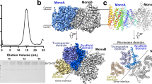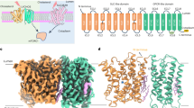 LYCHOS is a symmetric dimer with a twofold rotation axis perpendicular to the membrane plane and a distinct concavity extending into the membrane from the side of lysosomal lumen along this axis (Supplementary Fig. 6a). Each monomer contains 17 transmembrane helices (TM) with TM1–TM10 constituting the PLD and TM11–TM17 constituting the GLD (Fig. 1e). The overall fold of the PLD is similar to that of auxin transporters20,21,22, with a root mean square deviation (RMSD) of 2.5 Å over 310 Cα atoms (DALI Z-score: 29.2) to Arabidopsis thaliana PIN1 (PDB: 7Y9T) when they are aligned (Supplementary Fig. 6b). The GLD is similar to class F GPCR, with an RMSD of 3.2 Å over 265 Cα atoms (DALI Z-score: 21.9) to Frizzled4 receptor (PDB: 6BD4) when they are aligned (Supplementary Fig. 6c). Like PINs, PLD’s ten transmembrane helices (TM1–TM10) comprise an inverted repeat of five transmembrane helices (Supplementary Fig. 6d). In each repeat, the fourth helix is bent by a conserved serine or a conserved proline residue in the middle: Ser144 in TM4 and Pro324 in TM9, identical to Pro111 in TM4 and Pro579 in TM9 of PIN1, respectively (Supplementary Figs. 5, 6e, f). These disrupted helices form an X-shaped crossover, indicating a putative unknown ligand binding pocket identical to auxin binding site in PIN1. Like PIN1, the PLD of LYCHOS monomer is divided into two domains: the scaffold domain and the transporter domain (Fig. 1e, f and Supplementary Fig. 6f). The scaffold domain comprises helices TM1, TM2, TM6 and TM7 and creates a large interface (1870 Å2) to the other monomer in the dimeric complex. This interface is primarily mediated by TM2 and TM7, with lipids in a groove between TM1, TM11 and the kinked TM6 (Fig. 1b–d and Supplementary Fig. 6g, h). Another lipid with an aliphatic tail was observed by sticking into the pocket constituted by TM3 and TM8 (Supplementary Fig. 6h). The identities of these lipid-like densities remain to be further investigated. The transporter domain consists of helices TM3–TM5 and TM8–TM10 and harbours the central X-shaped crossover.