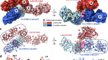 mCherry-R699 was first purified using immobilized metal affinity chromatography, as described above. The eluted recombinant protein was cleaved with PreScission protease at 4 °C for 18 h while dialyzing in gel filtration buffer (20 mM Tris, pH 8.0, 200 mM NaCl). After PreScission protease cleavage, R699 was purified again using reverse immobilized metal affinity chromatography to remove mCherry protein and other contaminants that bind to nickel resin. The eluted protein was further purified by gel filtration using a Hiload 16/60 Superdex 200 PG column at a flow rate of 1 ml per minute. Peak fractions were combined and concentrated for crystal trials. High-quality crystals were obtained via hanging drop vapor diffusion using a Mosquito liquid handling robot (TTP Labtech) with a 200-nL drop. For R699 with Mn2+ structure, R699 (30 mg ml−1), supplemented with 2 mM manganese(II) chloride, was mixed with 200 mM ammonium formate, 20% (w v−1) PEG 3350 at a 1:1 ratio and incubated at 18 °C. For R699 with Mn2+ and UDP structure, R699 (12 mg ml−1), supplemented with 10 mM manganese(II) chloride, 10 mM UDP-glucose, and 50% glycerol, was mixed with 180 mM ammonium chloride, 18% (w v−1) PEG 3350, and 4% (v v−1) 1-Propanol at a 1:1 ratio and incubated at 18 °C. For R699 with Mn2+, UDP, and kojibiose structure, R699 (28 mg ml−1), supplemented with 10 mM manganese(II) chloride, 10 mM UDP-glucose, 0.15 g ml−1 glucose, and 0.15 g ml−1 galactose, was mixed with 100 mM HEPES pH 7.0, 10% (w v−1) PEG 6000 at a 1:1 ratio and incubated at 18 °C. Diffraction data were collected on the 22-ID beamline of SERCAT at the Advanced Photon Source, Argonne National Laboratory (Supplementary Tables 1–3) using SERGUI at 110 K with a wavelength of 1.0 Å. Data were processed using XDSgui and DIALS included in CCP447,48,49,50. An initial R699 crystal structure was solved by molecular replacement with Phenix using RoseTTAFold and AlphaFold models as search templates51,52. The refined individual domains were then used as search models for solving the other R699 crystal structures. The structures were then fully built and refined iteratively using Coot and Phenix53,54,55, respectively. Protein structure similarity was compared using the Dali server56,57, while structure interface analysis was performed using the protein interfaces, surfaces, and assemblies’ service PISA at the European Bioinformatics Institute58. The initial cartoons of disaccharides in the R699 active site were constructed using Ligplot+59. Molecular graphics were prepared using Pymol.