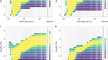 The system appears to possess higher \({{{\rm{Re}}}}\) values for higher Ra in general, but intriguingly, these values at the SSSs exhibit differences with orders of magnitude. Such enormous differences may be associated with those of Pr, as viscous dissipation becomes stronger as Pr increases, resulting in lower \({{{\rm{Re}}}}\). Accordingly, the Péclet number \({{{\rm{Pe}}}}={U}_{{{{\rm{rms}}}}}H/\kappa={{{\rm{Re}}}}\,\Pr\), the ratio of advective and diffusive transports, offers an impartial comparison across different Pr conditions in evaluating the kinetic energy production rather than \({{{\rm{Re}}}}\). We map the Pe values achieved at the SSSs versus Ra in Fig. 2e. The inset shows \({{{\rm{Re}}}}\) versus Raz for reference. It is evident that Raz solely does not grasp the increment of Pe (or \({{{\rm{Re}}}}\)) from the scattered symbols in the inset. Conversely, Pe exhibits an excellent collapse when plotted against Ra (see the comparison across different parameters in Supplementary Information, Supplementary Fig. S3). This remarkable collapse upholds the propriety of the proposed hybrid Rayleigh number Ra as the fundamental parameter. It also provides the best power-law fitting of Pe ∝ Ra0.58±0.23 as indicated by the orange solid line. Despite the different thermal forcing conditions, the obtained exponent, 0.58, agrees well with the existing scaling \({{{\rm{Re}}}} \sim {{{{\rm{Ra}}}}}_{z}^{2/3}\,{\Pr }^{-1}\) established for the boundary-layer dominated large-Pr RBC, where the thickness of the viscous boundary layer is comparable with the system height H38,39. Although the latter scaling was originally designed for RBC, considering the kinetic energy production from the present system’s available potential energy, ~ (1 + Θ) Raz, the scaling is replaced with Ra spontaneously, leading to \({{{\rm{Re}}}}\,\Pr={{{\rm{Pe}}}} \sim {{{{\rm{Ra}}}}}^{2/3}\) with the exponent similar to that in the experiments.