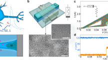 We compare these results with the bursting activity of biological cortical neurons recorded in the monkey premotor cortex (PM) using publicly available spiking data40. Intensive spiking activity (‘bursting’) alternates with quiet intervals in both biological PM neurons (Figs. 2A and S3A), measured transneurons (e.g. Fig. 3F–J), and simulated transneurons (Figs. 5D and S2B, C) within a specific window of external voltages. We add the \(({{CV}}_{1}\,,{{CV}}_{2})\) points for bursting PM neurons to Fig. 5A (orange triangle), revealing significant overlap with the simulated and measured \(({{CV}}_{1}\,,{{CV}}_{2})\) points for artificial transneurons. Indeed, the convex hull of the measured \(({{CV}}_{1},\,{{CV}}_{2})\) points for transneurons covers 100% of PM \(({{CV}}_{1},\,{{CV}}_{2})\) points (see Fig. S6 in SI). This finding suggests that transneurons can also emulate features of spiking activity in the PM cortex.