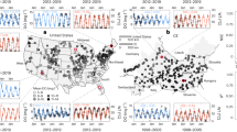 To analyze post-flood recovery dynamics, we calculated post-flood recovery rates for DO and DO%sat as the linear regression slopes of these parameters at each monitoring site, measured at 1, 3, 5, 7, and 9 days post-flood (Fig. 5). These recovery rates were then correlated with agricultural and urban land use (within 30 km radius of each site) to assess land use influences on post-flood DO recovery (Fig. 5). We further calculated the ratios of DO, DO%sat, water temperature, and turbidity between flood and post-flood periods (four to nine days after the flood threshold)—i.e., DOflood:DOpost-flood, DO%sat flood:DO%sat post-flood, WTflood:WTpost-flood, and Turbidityflood:Turbiditypost-flood—from the same 1156 rivers monitored nationwide (Supplementary Figs. 4, 5). The post-flood period was selected as 4 to 9 days after the flood threshold to avoid lingering flood impacts while minimizing the influence of long-term environmental changes.
