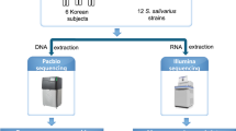 In the preNuc method, a 1 mL saliva sample was suspended in 500 μL of phosphate-buffered saline (PBS) and centrifuged at 12,000 × g for 10 min at 4 °C. The supernatant was discarded, and the pellet was suspended using 500 μL of Tris/MgCl buffer (40 mM Tris/HCl, 10 mM Mg/Cl2). Next, DNase I (50 units) (NIPPON GENE, Tokyo, Japan, cat: 314-08071) and RNase I (5 μg/mL) (NIPPON GENE, Tokyo, Japan, cat: 312-01931) were added and incubated for 30 min at 37 °C followed by centrifugation at 12,000 × g for 10 min at 4 °C. The supernatant was discarded; subsequently, the pellet was suspended in 2 ml of PBS, centrifuged at 12,000 × g for 10 min at 4 °C. The supernatant was discarded, and the pellet was suspended in 800 μL of TE20 buffer (10 mM Tris, 20 mM EDTA). The mixture was mixed with 50 μL of Lysozyme solution (300 mg/mL) (Sigma-Aldrich, MA, USA, cat: L6876) and 20 μL of Achromopeptidase solution (100 units/μL) (FUJIFILM Wako Pure Chemical Corporation, Japan, cat: 015-09951), and then incubated for 2 h at 37 °C. The solution was incubated for 1 h at 55 °C with 10% SDS solution (final concentration 1%) and Proteinase K (0.5 mg) (Sigma-Aldrich, MA, USA, cat: 647-014-00-9). The lysate was treated with phenol/chloroform/isoamyl alcohol (NIPPON GENE, Tokyo, Japan, cat: 311-90151), and DNA was precipitated using isopropanol. DNA was further treated with RNase (NIPPON GENE, Tokyo, Japan, cat: 312-01931) and precipitated using polyethylene glycol solution. DNA was rinsed with 75% ethanol, dried, and dissolved in TE buffer (10 mM Tris-HCl, 1 mM EDTA)46.