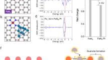 To elucidate the mechanism behind the enhanced NO3RR activity, we performed theoretical calculations on the metamaterial catalysts, characterized by the surface step defects and inhomogeneous lattice strain induced by dense dislocation network (Fig. 5a). Thermodynamically, strong affinity for NO3− is a critical prerequisite for efficient NO3−-to-NH3 conversion39. Figure 5b and Supplementary Figs. 33–36 summarize the calculated values of Gibbs free energies (ΔG*NO3). FeCoNi catalyst presents more active sites than the single metal slab. The nine adsorption sites of the FeCoNi-LBL slab exhibit a wide range of ΔG*NO3 values, spanning from 0.68 to −0.72 eV. Active sites on stepped FeCoNi contribute to lower ΔG*NO3 values from 0.54 to −1.12 eV, indicating the variation in atomic coordination induced by screw dislocation can drastically enhance the adsorption of NO3−. Subsequently, the lattice tensile strain from the high-density dislocation network was introduced in a stepped FeCoNi slab (Fig. 5b). The stepped FeCoNi under 3% tensile strain exhibits optimized ΔG*NO3 values ranging from 0.36 to −1.21 eV. Notably, at 6% tensile strain, NO3− adsorption is further enhanced across various active sites, with Gibbs free energy changes ranging from −0.01 to −1.26 eV. Specifically, the bridge site of Fe-Fe contributes to the most favorable NO3− adsorption, suggesting that strong adsorption of NO3 lowers the energy barrier of the initial discharge step (*+NO3−→ *NO3 + e−) (Fig. 5b).