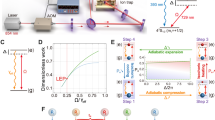 where \({H}_{f}=H+({J}_{1}\left\vert 1\right\rangle \left\langle {e}_{1}\right\vert+{J}_{2}\left\vert 2\right\rangle \left\langle {e}_{2}\right\vert+{{{\rm{H.c.}}}})\) with \(H=\frac{{\Omega }_{1}}{\sqrt{2}}\left\vert 0\right\rangle \left\langle 1\right\vert+\frac{{\Omega }_{2}}{\sqrt{2}}\left\vert 1\right\rangle \left\langle 2\right\vert \!+{{{\rm{H.c.}}}}\), \({L}_{f,1}=c\left\vert 0\right\rangle \left\langle {e}_{1}\right\vert\), \({L}_{f,2}=c\left\vert 1\right\rangle \left\langle {e}_{1}\right\vert\), \({L}_{f,3}=c\left\vert 3\right\rangle \left\langle {e}_{1}\right\vert\), \({L}_{f,4}=c\left\vert 0\right\rangle \left\langle {e}_{2}\right\vert\), \({L}_{f,5}=c\left\vert 2\right\rangle \left\langle {e}_{2}\right\vert\), \({L}_{f,6}=c\left\vert 3\right\rangle \left\langle {e}_{2}\right\vert\), and \(c=\sqrt{\Gamma /3}\). Here, Ω1,2 (J1,2) are controlled by the microwaves (370 nm lasers B and C), and Γ = 1/τP ≈ 2π × 19.6 MHz with τP ≈ 8.12 ns being the lifetime of the 2P1/2 states64. Note that theoretically we have neglected the decay of the 2P1/2 states towards 2D3/2 due to the small branching ratio (~0.5%), and experimentally we use a 935 nm laser to pump the leakage into 2D3/2 back to the 2S1/2 manifold (see Supplementary Information S-1 for details). The full system master equation [Eq. (8)] can be rewritten as