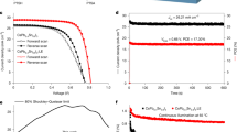The surface potential distribution of perovskite films and its correlation with electronic properties were then studied by kelvin probe force microscopy (KPFM) measurements (Supplementary Fig. 22). Before illumination, the control film exhibits a broad potential distribution centered around −20 mV, indicating considerable non-uniformity and a high surface defect density. The NTS-treated film displays a much narrower distribution centered at 416 mV, reflecting improved surface potential uniformity. The more positive potential in the NTS-treated film suggests enhanced n-type characteristics, facilitating electron transport across the surface and improving charge extraction. After 40 h of illumination, high work function regions, corresponding to the formation of degradation products such as PbI2 emergence in the control film, which could be attributed to the light-induced iodide migration and structural instability71. While the NTS-treated film maintains a uniform surface potential distribution, indicative of a suppressed decomposition.