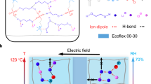 DEAs with ionic conductive gel electrodes have demonstrated promising actuation performance and a wide range of applications, such as soft grippers with thermostable organohydrogel electrodes working at high or low temperatures26. Transparent gel electrodes paired with transparent DE layers allow for imperceptible actuation, useful for displays, tunable lenses, or camouflage27,28,29. The commonly used hydrogel electrodes such as polyacrylamide with LiCl undergo the inevitable evaporation of water inside the polymer network, causing thermostability issues30. Ionogels with nonvolatile ionic liquid are thermally stable and exhibit self-healing capability, which contributes to the durability of DEAs. Cao et al. developed a transparent and self-healing ionogel electrode composed of PVDF-HFP blended with EMIM OTF for DEAs, which showed an area strain of 22.6% at 5 kV, and maintained the strains after 24 h of self-healing18. Cheng et al. reported a water-stable PVDF-HFP-EMIM TFSI composite electrode for amphibious DEA based crawling robotics, where the electrode could self-heal in 5 min, highly shortening the recovering time for DEAs21. However, the Young’s moduli of these ionogel electrodes for DEAs are not low enough (several tens or hundreds of kPa), leaving much room for breakthroughs in soft electrodes with enhanced actuation strains of DEAs. Poly(ionic liquid) (PIL), a subcategory of ionogels, showcases excellent compatibility of ionic liquid with polymer network, and its elastic modulus can be adjusted to below 1 MPa and attained self-healing capability by blending with additional ionic liquid31, or increasing solvent amount in precursors32. Consequently, PIL has emerged as a promising candidate for DEA electrodes22.