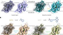 Notably, when compared with the binding position of taurine, GABA and GAA extend further towards the intracellular pathway (Fig. 3b and Supplementary Fig. 8e). The extended carbon linker of GAA has the potential to adopt a bent conformation, thereby facilitating more extensive interactions with TauT (Supplementary Fig. 8e). Despite presenting different conformations, the extracellular gate, formed by residues from the TM1b, the TM3, the TM6a, and the TM10, is closed among all structures. The intricate interactions at this closed extracellular gate include a comprehensive network of hydrogen bonds. Phe300 on TM6a directly overlays the taurine and GABA molecules, with Arg66 on TM1b stabilizing the conformation of Phe300 through a cation–π interaction. In addition, Arg66 forms hydrogen bonds with Asp459, Ser464, and Gln297, further stabilizing the closed extracellular gate (Fig. 3h). Furthermore, the high-quality electron microscopy map facilitated the assignment of the N-terminal below the transmembrane domain in the occluded TauTTau and TauTβ-Ala (Fig. 3f and Supplementary Fig. 8c). Residue Arg41 potentially forms an electrostatic interaction with Asp416 in the TM8 and establishes a cation-π interaction with Tyr315 in the TM6. Residue Trp44 engages in hydrophobic interactions with Phe50 and Tyr315, causing TM1 to draw closer to TM6, ultimately resulting in an occluded conformational state (Fig. 3g). However, this N-terminal segment was unresolved in other states. In light of its intimate connection with TM1a, we posit that the interaction between the N-terminal segment and the transmembrane domain plays a pivotal role in stabilizing TauT in its occluded state. The comparative structural analysis of TauT within the context of the GABA transporter subfamily is of paramount importance for elucidating the functional plasticity inherent within this subfamily. Within this subfamily, the repetition of internal structures and hinge movements facilitates the alternating access transport mechanisms, enabling the substrate-binding site to toggle its accessibility between the extracellular and cytoplasmic membranes. The diverse conformations captured in the cryo-EM structures of TauT provide a comprehensive roadmap for understanding substrate recognition, which is crucial for the future design of innovative drug targeting TauT.
