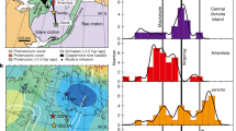 The lithosphere underlying the Nipigon Embayment corresponding to C2 (Fig. 2b) is coincident with anomalously low seismic velocities at depths of 100–200 km (as imaged via studies with high lateral resolution)24,25 and an overall reduction in shear-wave splitting relative to the high split times observed elsewhere in the SW Superior25, both of which are inferred to be a result of MCR-related activity. Elevated ρx and relatively stable ρy within the region further suggest that the bulk lithosphere is similar to that found elsewhere within the SW Superior, while the properties of the N-S channels vary relative to those corresponding to C1. Synthetic modeling using MATE (Fig. 3b) suggests that the ρx for C1 may be matched using phlogopite volumes of up to 5% (with variable interconnection), while the resistivities for the less conductive C2 may be fit by hydrated lherzolite, or phlogopite at lower (1–2%) volumes and/or decreased interconnection. Thus, we suggest that the N-S channels in C1 pre-date the MCR and that MCR-related heating and/or melts may have preferentially affected the composition of the material between the channels, resulting in disconnection, replacement, and/or overprinting of phlogopite with more resistive, seismically slow minerals, as seen within C2.