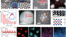 Pt nanoparticles (PtNP) were loaded onto OM CeO2 and CeZrO2 using a microwave-assisted dip-coating method, achieving a Pt loading of 0.4 gPt/L (0.04 wt.%, ICP data)14. Rapid microwave drying ensured the uniform distribution of Pt. A thermal aging test was conducted under standard conditions (800 °C in air for 50 h) to evaluate the high-temperature stability of the PtNP/CeZrO2 catalyst7. As illustrated in Fig. 1c, it rapidly transformed into a single-atom PtSA/CeZrO2 structure within seconds through an atom trapping mechanism and remained stable, resisting Pt sintering, throughout the 50-h aging process7. EXAFS spectra in Fig. 1d demonstrate that the aged PtSA/CeZrO2 catalyst exhibits a prominent Pt–O peak and small Pt–Ce peaks, while the PtNP sample shows a significant Pt–Pt peak15. This demonstrated the conversion of PtNP/CeZrO2 into PtSA/CeZrO2 during aging at 800 °C. STEM images of PtNP/CeZrO2 (Fig. 1e) revealed uniform Pt nanoparticles on the (111) plane of CeZrO2, with an interplanar d-spacing of 0.31 nm and an average particle size of approximately 2.1 nm. STEM results (Fig. 1f) confirmed that the bright contrast spots localized on the Ce/Zr atomic rows, indicating isolated Pt atoms in the Ce vacancies. The single-atom nature of supported Pt was further confirmed by CO-DRIFTS (Supplementary Fig. 8), where, unlike PtNP/CeZrO2 and PtNP/CeO2, both PtSA/CeZrO2 and PtSA/CeO2 exhibited only a linear CO peak at 2101–2112 cm−1, indicating CO adsorption on isolated Pt atoms8.