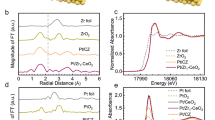 The CeZrO2 DFT model and the loading position of PtSA were optimized, as detailed in Supplementary Fig. 19. The most thermodynamically stable configurations of PtSA/CeO2 and PtSA/CeZrO2 are shown in Supplementary Fig. 20, where PtSA bonds with six oxygen atoms on pure CeO2, but coordinates with four oxygen atoms in CeZrO2. Furthermore, thermodynamic calculations demonstrate that the lowest formation energy occurs when PtSA is anchored near Zr atoms and oxygen vacancies (Ov). The STEM results (Supplementary Fig. 21) also show an asymmetric atomic distance on both sides of the PtSA bright spots, which is caused by local lattice distortion induced by the differences in the atomic radii and electronegativity between Ce and Zr. This further indicates that Pt is more likely to be loaded around Zr atoms. To further confirm changes in the local coordination environment of PtSA sites in the Zr-doped sample, EXAFS was fitted with the results shown in both R space and k space (Fig. 3c, d and Supplementary Fig. 22). In contrast to the symmetric Pt–O(-Ce) peak around 1.71 Å in PtSA/CeO2 (Fig. 3c), the peak in PtSA/CeZrO2 exhibits asymmetry (Fig. 3d and Supplementary Fig. 23), due to Pt loaded around Zr atom and the co-existence of Pt–O(Ce) and Pt–O(Zr) bonds with different but similar bond lengths15. As summarized from real-space fitting data (Supplementary Table 3), the coordination number of the Pt–O bond on PtSA/CeO2 (~5.8) is higher than that on PtSA/CeZrO2 (~4.1), demonstrating that a low-coordinated PtSA catalyst is constructed by Zr doping. Meanwhile, an asymmetric square-planar Pt1O4 geometry of PtSA/CeZrO2 was evidenced by three shorter Pt–O(Ce) of 1.67 Å and one longer Pt–O(Zr) of 1.97 Å. Based on the Raman, DFT, and EXAFS results, we concluded that the simple Zr doping strategy stabilized PtSA/CeZrO2 in a low-coordination state even after aging at 800 °C, avoiding an oversaturated PtSA supported in pure CeO2.