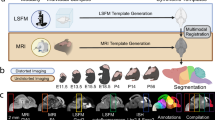 We used the serial two-photon tomography volumes provided in the supplementary material of the publication by Newmaster and colleagues13 (male and female Otr-Venus mice on a 129 × C57BL/6 J mixed background). These files were shared as one .tif file for each age (P7, P14, P21, and P28). The original volumes had non-isotropic voxels with a 20 × 20 × 50 µm resolution. We resampled them to isotropic 20 × 20 × 20 µm voxel size using AMIRA (version 6.3.0; https://www.thermofisher.com/no/en/home/electron-microscopy/products/software-em-3d-vis/amira-software.html). We also used the P4 volume shared by Liwang and colleagues14 (male and female Vip-Cre; Ai14 mice), which was provided as a .tif file with isotropic 20 × 20 × 20 µm voxel size. All volumes were converted to .nii.gz files for further processing. We further used the 3D developmental common coordinate framework (DevCCFv001) segmentation volume provided by Kronman and colleagues15,24. The DevCCFv001 atlas is provided in Allen CCFv3 space at 10 µm resolution, but contains segmentations following a developmental vertebrate ontology29,37 resembling what was used for the 2D Allen Developing Mouse Brain Atlas.