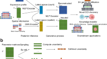 We include 28 datasets profiled from sequencing-based ST technologies, including 10× Visium, and 25 datasets from imaging-based ST technologies, such as seqFISH+, MERFISH, and NanoString CosMx SMI. For each ST dataset of \({G}_{1}\) genes and \({C}_{1}\) cells, we select a corresponding scRNA-seq dataset of \({G}_{2}\) genes and \({C}_{2}\) cells from the same tissue type as the reference with \({G}_{2}\gg {G}_{1}\). For SC data, low-expression genes are filtered out by retaining only those expressed in at least 10% of the cells. Raw counts of both SC and ST datasets are preprocessed using the \(\log 1p\) transformation54,55, defined as \(\log 1p(x)={\mathrm{ln}}(x+1)\). This transformation helps reduce data skewness and mitigates the impact of extreme values. The processed ST and SC gene expression data is denoted as \({X}_{{st}}\in {R}^{{G}_{1}\times {C}_{1}}\) and \({X}_{{sc}}\in {R}^{{G}_{2}\times {C}_{2}}\), respectively. The individual cell-level information in \({X}_{{sc}}\) carries significant noise due to dropouts, duplets, inaccurate cell segmentation, and RNA degradation. Instead of representing the gene expression of a gene in all \({C}_{2}\) cells, we employ Leiden clustering to group cells into \(K\) clusters and use the median expression of the gene in each cluster to represent the gene. Thus, we derive \({\widetilde{X}}_{{sc}}\in {R}^{{G}_{2}\times K}\) from \({X}_{{sc}}\).