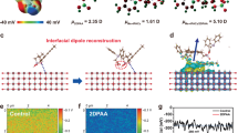 It was reported that SAMs have difficulty achieving uniform distribution on the surface of transparent electrodes (e.g., ITO or Fluorine-doped Tin Oxide (FTO)), which reduces the reproducibility of device performance23. The research shows that compared with ITO or FTO, NiOx can form stronger chemical bond with SAMs, which is beneficial to deposit uniform SAMs at NiOx surface, thereby enhancing device photovoltaic performance and reproducibility10,24,25. This suggests that adopting self-assembled organic molecules to modify NiOx is expected to simultaneously overcome the instability induced by SAMs or NiOx. In view of the above considerations, various SAMs have been employed to modify NiOx and construct dual HTLs24,25,26,27. For example, Chen et al.26 used 4-chlorobenzene sulfonic acid (CBSA) to modify NiOx/perovskite interface. Chlorine atoms on the benzene ring can provide growth sites for perovskites and release interfacial stress, while the sulfonic acid group (-SO3H) at the other end of the benzene ring can passivate the Ni3+ defect. CBSA modification can suppress interfacial chemical reactions, finally enhancing device stability and PCE. Besides, You et al.24 employed [4-(3,6-dimethyl-9H-carbazol-9-yl)butyl]phosphonic acid (Me-4PACz) SAMs to modify NiOx/perovskite interface. Yan et al.25 first used Me-4PACz SAMs to modify NiOx and then deposited Lewis base molecule 1,3-bis(diphenylphosphino)propane (DPPP), which passivated undercoordinated Pb2+ defects. As a result, the PCE of the modulated device was slightly increased after 3500 h of maximum power point (MPP) tracking. Zhu et al.27 adopted -OCH3 group functionalized SAM (4-(3,11-Dimethoxy-7H-dibenzo[c,g]carbazol-7-yl)butyl)phosphonic Acid (MeO-4PADBC) to stabilize NiOx/perovskite interface. The -PO3H2 at one end of MeO-4PADBC can anchor to the surface of NiOx and passivate the uncoordinated Ni3+ and Ni2+ defects, while the -OCH3 at the other end of MeO-4PADBC can passivate the uncoordinated Pb2+ defects through coordination action, improving the stability of the interface and device.