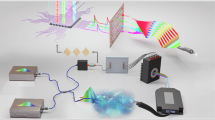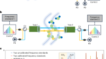 Benefiting from the frequency agility of the electro-optic dual-comb system44, the broadband transition spectrum can be obtained through central wavelength tuning of the CW laser. Figure 3f shows the stitching spectrum (red line) from 1525 to 1540 nm with a spectral resolution of 125 MHz, covering the P-branch spectral lines of the acetylene vib-rotational band (\({\upsilon }_{1}+{\upsilon }_{3}\)), where the total power is as low as 2.13 pW and the measurement time of the single unstitching spectrum is 1 s. The broadband spectrum reconstructed by DC-GIS has excellent agreement with the simulation result of the HITRAN database45, as shown by the blue line in Fig. 3f. In Supplementary Information note 3, we present a practical scheme for broadband spectral measurements of single-photon DC-GIS, which we are currently working on.
