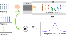 where \(\Delta T\) is the time-domain duration of DCS. The reference spectra \({{{\bf{S}}}}_{{{\rm{M}}}\times 1}\) can be obtained by performing Fourier transform on the vector of the sampling signal \({\left|{{{\bf{E}}}}_{{{\rm{M}}}\times 1}\right|}^{2}\),