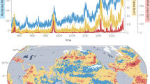 In response to thermal stress during successive and persistent MHWs, the NESAP experienced changes in plankton community structure and POC production and export, as summarized in Table 1. At the start of the first MHW in 2014, production was nearly balanced by export with no anomalous ∆POC accumulation observed (Fig. 3a), similar to historical observations in the region25,29. As thermal stress persisted into 2015, POC export became imbalanced and resulted in mesopelagic particle accumulation (Fig. 3b) likely caused by changes in zooplankton community structure (Figs. 5, S9) and vertical migration patterns between sunlit and dark ocean waters. For instance, two radiolarian groups, Acantharea and especially Spumellarian genus Cladococcus, were elevated in summer 2015 (Fig. 5). These protozooplankton groups can be important carbon exporters out of the euphotic zone32,33,34,35,36 due to their strontium and silicate skeletons, respectively, and because they reside in epipelagic and mesopelagic waters31,36. Furthermore, radiolarians are thought to be a source of minipellets, 3-50 um in size and comprising a notable amount of particles in sediment traps32,37. In addition to the adult and juvenile organisms themselves34, these minipellets may have contributed to the accumulation of particles in the upper mesopelagic waters38 during the 2015 MHW. Similarly, the higher abundance of the small copepod Oithona in 2015 (Figs. 5, S9) could have further contributed to the production and continued accumulation of small slow to non-sinking fecal pellets26,39,40 in upper mesopelagic waters (Fig. 2e), decreasing the prospects for rapid, deep particle export.