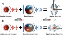 In contrast, here we make use of a curved 2D spectral surface \({{{\mathcal{S}}}}({k}_{x},{k}_{y},\omega )\) as a base space in the \({{\mathbb{R}}}^{3}\) momentum-energy domain of a pulsed optical field in narrowband paraxial regime (Fig. 1b–d); where kx and ky are the transverse components of the wave vector, and ω is the temporal frequency. We map the meron texture from the hemisphere in parameter space to the Stokes vector on \({{{\mathcal{S}}}}({k}_{x},{k}_{y},\omega )\), such that \({{{\bf{n}}}}({{{\bf{r}}}})\,=\,\left({s}_{1}({{{\bf{r}}}}),{s}_{2}({{{\bf{r}}}}),{s}_{3}({{{\bf{r}}}})\right)\); here s1, s2, and s3 are normalized Stokes parameters. Scalar optical fields restricted to simple 2D spectral surfaces are known as STWPs30,47, whose characteristics are useful for a variety of applications30,31. First, note that a one-to-one relation enforced between the transverse radial wave number \({k}_{r}\,=\,\sqrt{{k}_{x}^{2}\,+\,{k}_{y}^{2}}\) and the temporal frequency ω leads to diffraction-free propagation30, thus potentially enabling the transportation of localized topological structures over extended distances47. Moreover, when the space-time coupling takes the form of a paraboloid \(\frac{\Omega ({k}_{r})}{{\omega }_{{{{\rm{o}}}}}}\,\approx \,\frac{{k}_{r}^{2}}{2{k}_{{{{\rm{o}}}}}^{2}(1-c/\widetilde{v})}\) (Fig. 1b), the optical wave packet travels rigidly at a controllable group-velocity \(\widetilde{v}\) in linear optical media32,33; here ωo is a carrier frequency, \({k}_{{{{\rm{o}}}}}\,=\,\frac{{\omega }_{{{{\rm{o}}}}}}{c}\) is the associated wave number, c is the speed of light in vacuum, and Ω = ω − ωo (Fig. 1b). The spatiotemporal spectrum of an azimuthally symmetric STWP can be represented by \(\widetilde{E}({k}_{r},\Omega )\,=\,\widetilde{E}({k}_{r})\delta (\Omega -\Omega ({k}_{r}))\), where \(\widetilde{E}({k}_{r})\) is the spatial spectrum, and the delta function is relaxed in practice and replaced with a narrowband spectral function33. After incorporating the meron polarization texture, the spatiotemporal spectrum of such ST merons in the circular polarization basis is: \(\widetilde{{{{\bf{E}}}}}({k}_{r},{\phi }_{k},\Omega )\,=\widetilde{E}({k}_{r},\Omega ){[\sin \frac{\theta ({k}_{r})}{2},-{e}^{i\chi ({\phi }_{k})}\cos \frac{\theta ({k}_{r})}{2}]}^{{{{\rm{T}}}}}\); here, “T” is the transpose operation, \(\theta \left({k}_{r}\right)\,=\,\pi -\arccos \frac{\kappa }{\sqrt{{k}_{r}^{2}+{\kappa }^{2}}}\), \(\chi \left({\phi }_{k}\right)\,=\,{\phi }_{k}+\gamma -\pi\), and \({\phi }_{k}\,=\,\arg ({k}_{x}+i{k}_{y})\) (see Supplementary Note I), and we set γ = π/2 to produce a Bloch-type topological structure. The vectorial field profile in physical space takes the form \({{{\bf{E}}}}(r,z;\tau )\,\propto \,\iint \,d{k}_{r}d\Omega \,\,\,{k}_{r}\widetilde{{{{\bf{E}}}}}({k}_{r},\Omega ){J}_{0}({k}_{r}r){e}^{-i\Omega \tau }\,=\,{{{\bf{E}}}}(r,0;\tau )\), where J0( ⋅ ) is the 0th-order Bessel function of the first kind33, and \(\tau \,=\,t-z/\widetilde{v}\) is a time frame moving at the group velocity \(\widetilde{v}\).