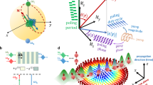 Skyrmions are represented by a continuous three-component unit vector field n(r) = (nx(r), ny(r), nz(r)) on a unit two-sphere parameter space; where r = (x, y, z) and x2 + y2 + z2 = 1. These configurations are distinguished by a non-zero topological Skyrmion number N14, which quantifies the number of times n(r) wraps around the unit sphere. Merons, or half-skyrmions, carry a skyrmion number \(N=\pm \frac{1}{2}\), indicating that n(r) covers only half the unit sphere, from the north pole to the equator (Fig. 1a). The meron texture is explicitly given in polar coordinates by: \({{{\bf{n}}}}(\rho,\phi )\,=\,\frac{1}{\sqrt{{\zeta }^{2}+{\Delta }^{2}}}\left\{\rho \cos (\phi+\gamma ),\rho \sin (\phi+\gamma ),\Delta \right\}\); where \(\rho \,=\,\sqrt{{x}^{2}+{y}^{2}},\quad \phi=\arg (x+iy)\), the parameter Δ specifies the meron radius, and the helicity γ ∈ ( − π, π] determines the chirality of the spin texture, which gives rise to a classification of merons into Néel-type (γ = 0) and Bloch-type (γ = ±π/2)14. Previous experimental realizations of optical skyrmions have relied on one of three strategies for mapping the vector n(r) to physical quantities45: (1) mapping n(r) to the normalized electric field vector6; (2) mapping n(r) to time-averaged spin vector7,22; and (3) mapping n(r) to the normalized Stokes vector in paraxial optical fields24,25,27,46. Whereas the first and second approaches all three field components and are thus associated with non-paraxial fields (for example, surface plasmon polaritons), we make use of the third approach, which is more suitable for transportable beams in paraxial optics. All these demonstrations were realized by mapping the 3D vector field n(r) from the parameter space to a flat 2D surface disk in \({{\mathbb{R}}}^{2}\) as a base space (real space), via a Hopf mapping (hopfions) or a stereographic projection (2D skyrmions)14; see Fig. 1a.