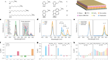 We begin by attempting to passivate top surface defects with PAs (Fig. 1a) via a post-deposition treatment of the herein used triple halide triple cation30 perovskite absorbers. For that purpose, we fabricate half-cell test structures (ITO/(4-(3,6-dimethyl-9H-carbazol-9-yl)butyl)phosphonic acid(Me-4PACz)/SiOx-np/perovskite) to track the changes in PLQY upon deposition of PAs (Fig. 1a) atop the perovskite. Then, we extract the non-radiative (NR) losses from PLQY measurements (measured from absolute steady-state PL) following: \(\Delta {V}_{{\mathrm{OC}},{\mathrm{non}}-{\mathrm{rad}}.}=\frac{{k_BT}}{q} * {\mathrm{ln}}({\mathrm{PLQY}})\). The average NR-loss of the bare absorber is 107 mV (on the hole transport layer stack) at carrier densities of ca. 1 sun (Fig. 1b). Upon deposition of methylphosphonic acid (MPA), the NR-loss increases slightly to an average of 109 mV, decreases slightly to 105 mV with benzyl PA (BPA), with fluorobenzyl PA (FBPA), it decreases to 93 mV and with pentafluorobenzyl PA (pFBPA) it decreases to 85 mV. The decrease in the non-radiative loss with pFBPA deposition shows that either the surface defect density is reduced (e.g., chemical passivation), or the minority/majority carrier concentrations are altered so that the effect of surface recombination is minimized, e.g., via field-effect passivation. To understand the cause of this surface passivation, X-ray photoelectron spectroscopy (XPS) measurements were conducted. Samples treated with the phosphonic acids show suppression of Pb0. Furthermore, we identify the formation of P-O-Pb bonds31 through the emergence of a shoulder in the Pb 4f signal at ~145 eV signal (Fig. 1c)23,24. All the PAs show a similar degree of Pb0 suppression, albeit it is unclear whether the phosphonic acids protected the perovskite absorber from X-ray or vacuum-induced degradation during the measurements, which prevents the formation of Pb0, or non-saturated Pb2+ is chemically passivated with phosphonic acids which, in turn, reduces the amount of Pb0. This raises two questions (1) Why did MPA not show any surface passivation effect, whereas BPA-derivatives, especially fluorinated ones, did? (2) Since Pb0 suppression is common to all the tested PAs—Fig. 1c is Pb0, in fact, an active defect center without the presence of C60? The strength of the P-O-Pb signature is anti-correlated with the size of the molecule, where smaller molecules, being likely more mobile and causing less steric hindrance, appear to be creating denser layers. The highest P-O-Pb signal is observed for MPA, followed by BPA, FPBA, and pFBPA in decreasing order. At the same time, the size of the molecule is correlated with its effectiveness in passivating, as observed above, where smaller molecules passivate worse. To understand these phenomena, we turn to density function theory (DFT) calculations focusing on the surface of a halide perovskite in the presence of the PAs.