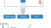 Although the positions of TADs are generally conserved in different cell types61, numerous studies have also shown that the intra-TAD structure can be significantly changed in cells with alterations in enhancer activity and gene expression62,63,64. Additionally, alterations in TAD structures have been identified in various cancers, but their functional impact remains largely uncharacterized. To investigate alterations in TADs and their potential regulatory functions during the radiation-induced malignant transformation of BEP2D cells, we first identified 3348 TADs in BEP2D cells and 3974 and 3746 TADs in radiation-induced BERP35T1 and BERP35T4 tumour cells, respectively, at 20-kb resolution (Fig. S2B). These results are consistent with previous studies that identified more TADs in tumour cells than in normal cells by Hi-C analysis16,65. Despite the increased number of TADs in tumour cells, the genomic positions of most TAD boundaries were conserved between BEP2D cells and both radiation-induced tumour cell lines (Fig. S2C). To investigate whether conserved TADs undergo structural and functional alterations during radiation-induced tumorigenesis, we compared the TAD boundaries in BEP2D, BERP35T1 and BERP35T4 cells and identified conserved TAD boundaries that were not shifted by more than 1 bin in either BERP35T1 or BERP35T4 tumour cells compared with BEP2D cells. A TAD was identified as a conserved TAD among all three cell types when both TAD boundaries were conserved. We identified 1874 TADs that were conserved among all three cell types (Supplementary Data 1). We previously showed that the spatial density of open chromatin (SDOC) is a key regulatory property associated with the TAD level63. In brief, SDOC quantitatively measures the level of spatial aggregation of active regulatory elements and reflects the regulatory properties of TADs. A higher level of SDOC indicates a more active regulatory state within the TAD, whereas a lower level of SDOC indicates a repressive regulatory state. To investigate the impact of TAD alterations on gene expression levels within these TADs, we calculated the SDOC level for the conserved TADs. Indeed, we identified 296 TADs with increased SDOC and 316 TADs with decreased SDOC in BERP35T1 tumour cells compared with BEP2D cells and identified 276 TADs with increased SDOC and 258 TADs with decreased SDOC in BERP35T4 tumour cells compared with BEP2D cells (Supplementary Data 2). In addition, genes located within TADs with increased SDOC tended to be upregulated (Fig. 2D), whereas the transcriptional activity of genes located within TADs with decreased SDOC tended to be repressed, during the radiation-induced malignant transformation of BEP2D cells (Fig. 2D). We also found that TADs with increased SDOC were more enriched in regions undergoing B-to-A compartment switching in radiation-induced tumour cells (Fig. 2E), and both were associated with increased gene transcriptional activity. The SDOC alteration in conserved TADs indicates functional changes in the chromatin state and structure of TADs and might underlie the dysregulation of gene transcription within these TADs in radiation-induced tumour cells. We demonstrated that genomic regions with compartment switching are associated with alterations in chromatin accessibility and transcriptional activity (Fig. 2F, S2D).