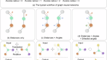 The architecture of our developed equivariant GNN model (equivGNN) is illustrated in Fig. 5a, which integrates atom embedding, equivariant message-passing, and readout blocks. The details of the equivariant message-passing process are shown in the “Methods” section. For node inputs, we map the atomic numbers to 92-dimensional vectors using atomic embedding from CGCNN29. As shown in Supplementary Table 1, we explore the influences of self-connection layers with various node attributes on the prediction performance and training efficacy of the model. Compared with the z-type and atomic node attributes, the one-hot-encoded group and period (G-P) as atom attributions with 26-dimensional vectors have the highest model prediction performance with the lowest time consumption. Therefore, the G-P (26) embedding method for node attributes is employed in the self-connection layer. The development details of the equivGNN are shown in the “Methods” section.