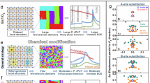 To investigate the substitution of Sm3+ and Li+ ions for the component ions in BaTiO3, high-angle annular dark-field scanning transmission electron microscopy (HAADF-STEM) imaging and corresponding atomic-resolution energy-dispersive X-ray spectroscopy (EDS) mappings of BT-0.03(Sm,Li) were captured. As shown in Fig. 1d, the large and small dots represent the A-site and B-site ions in the perovskite lattice, respectively. By comparing the EDS mapping of the Sm element with the Ba element mappings (Fig. 1e,f), it is evident that the doped Sm3+ ions replace the A-site Ba2+ ions. While it is difficult to directly trace Li+ ions via EDS due to the small atomic number, we hypothesize that the doped Li+ ions also occupy the A site rather than the B site, considering their electronegativity is similar to that of the A site Ba2+ ions. According to the electroneutrality principle, as an acceptor, the equivalently doped Li+ ions tend to replace Ba2+ ions at the A site to neutralize the positive charges of SmBȧ. Otherwise, additional oxygen vacancies \(({V}_{o}^{\cdot \cdot })\) must form to compensate for the negative charges if Li+ ions replace Ti4+ ions at the B site in the lattices. This is confirmed by the high-resolution X-ray photoelectron spectroscopy (XPS), which shows no increase in the \({V}_{o}^{\cdot \cdot }\) concentration in BT-0.03(Sm,Li) compared to that of pristine BaTiO3, further indicating that the Li+ ions substitute at the A-site (Supplementary Fig. 4). We also postulate that Li+ ions tend to locate adjacent to the Sm3+ ions, forming defect dipoles within the BaTiO3 lattice. The statistics in Fig. 1g,h show the lattice c/a ratio distributions extracted from the atomic-scale HAADF-STEM mappings of Ba0.97Sm0.03TiO3 (BT-0.03Sm) and Ba0.94Sm0.03Li0.03TiO3 (BT-0.03(Sm,Li)), respectively. Since the ionic radii of both Sm3+ and Li+ are smaller than that of Ba2+, if the doped Li+ ions substitute randomly at the A site, rather than forming defect dipoles with Sm3+, both the a and c axis of the lattices would decrease synchronously, resulting in an approximately constant c/a ratio (Supplementary Fig. 5)33,34,35,36. However, as shown in Fig. 1i, the average c/a ratio of BT-0.03(Sm,Li) is lower than that of BT-0.03Sm, signifying that the Sm3+ and Li+ ions occupying the A-site form defect dipoles (SmBȧ-LiBaʹ). An important point is that these defect dipoles, which occupy neighboring A sites in the lattices along the [001]c direction, align with the spontaneous polarization direction of the intrinsic Ti⁴⁺-O²⁻ dipoles in BaTiO3. As a result, they are expected to contribute to additional polarization.