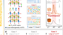 In addition to the dielectric behavior, the concentration of (SmBȧ-LiBaʹ) defect dipoles also plays a significant role in the polarization of BT-xSL. As shown in Fig. 2b,c and Supplementary Fig. 9, the polarization increases substantially from 18.9 μC cm−2 in BaTiO3 to 28.2 μC cm−2 in BT-0.03(Sm,Li) under 80 kV cm−1, and then decreases with further increasing defect dipole concentration (Supplementary Fig. 9). The larger polarization of BT-0.03(Sm,Li) suggests an enhanced ECE14,39, indicating its superior performance in solid-state cooling (Supplementary Note 3). It is important to emphasize that the observed polarization increase originates from the presence of (SmBȧ-LiBaʹ) defect dipoles, rather than the individual contributions from Sm or Li doping. As shown in Fig. 2b, Sm doping narrows the polarization-electric field (P-E) loop by disrupting the long-range ordering of the lattice, which is confirmed by the diffused phase transition (Supplementary Fig. 8). However, this effect has minimal influence on the polarization at elevated electric fields40,41. In contrast, the introduction of Li+ induces a stronger local ferroelectric distortion (Supplementary Table 5), leading to an increase in remanent polarization42. Despite this, the polarization at high fields only shows a moderate increase with Li doping, as displayed in Fig. 2c. In addition, due to the pyroelectric effect43, both maximum polarization and remanent polarization of the samples decrease with increasing temperature (Fig. 2d, e and Supplementary Fig. 10).