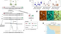 To develop maize NILs, the inbred line 2-9m, characterized by nine linked mutant alleles for phenotypic traits (Supplementary Table 4), was used as the male parent in crosses with two inbred lines, Ku123 and MK01. The multimarker line 2-9m was developed in the early 1980s in Moldova from a cross between two previously established lines carrying markers on chromosome 2 (ws3,lg1,gl2), and chromosomes 9 and 10 (c1,sh1,wx1,R1). These parental lines carried dominant alleles at the loci of interest, except for the recessive r1 allele31. After two rounds of self-pollination with phenotypic selection, four to six backcrosses were performed using either MK01 or Ku123 as the recurrent parent (Fig. 1i and Supplementary Table 12).
