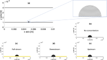 where g is the change in height due to growth, and e is the height loss rate due to erosion. If g > e, the microcolony grows, and if g < e erosion will reduce the height of the colony. This is visualized in Fig. 8. When the right-hand side is zero (g = e), the microcolony has reached an equilibrium height \({h}_{\max }\) (green-centred structure in 8). We model g as a constant with a value determined by the biological properties of the biofilm. In general, the growth rate can be modelled with a Monod term to account for the effects of nutrient gradients. However, here we want to focus on friction-limited growth and thus assume that the flow is fully mixed and saturated with nutrients and oxygen.