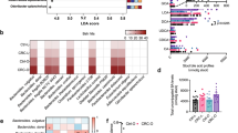 The mechanisms underlying tumour promotion/suppression by the daily diet and gut probiotics were explored using liquid chromatograph mass spectrometry (LC‒MS/MS) to detect changes in the serum metabolites of the CD, HFD, and HFD + B. breve groups. As shown in Fig. 5A, clearly distinguishable clustering of the CD and HFD groups was revealed by principal component analysis (PCA), indicating that the serum metabolite profile changed significantly with the diet. Minimal adjustment was observed after the administration of B. breve. The three groups shared 228 common metabolites, including amino acids and their derivatives, bile acids (BAs), nucleotides and their metabolites, and organic acids and their derivatives. Moreover, each group presented unique metabolites, although the numbers were not comparable (Fig. 5B). We screened the differentially abundant metabolites through pairwise comparisons and identified 11 metabolites that were up- or downregulated between the CD and HFD groups; 5 of these metabolites were altered as a result of the B. breve intervention (Fig. 5C). Notably, substantial increases in the taurocholic acid (TCA) and taurodeoxycholic acid (TDCA) levels were observed in the HFD group, but were reduced by B. breve treatment (Fig. 5D). Similarly, we did observe an increased serum TCA concentrations in obese individuals and type 2 diabetes patients (Supplementary Fig. 5A, B) and circulating TCA levels can also be used as a prediagnostic marker for obesity-related tumours, such as hepatocellular carcinoma and colorectal cancer22,23. Additionally, a negative correlation between the serum TCA concentration and the relative abundance of Bifidobacterium in the gut was observed (Fig. 5E, Supplementary Fig. 5C). We examined the mRNA expression of enzymes responsible for the synthesis of primary bile acids, conjugation to either taurine or glycine, and secretion in the liver, and only Cyp27a1 and Cyp7b1 in the ‘alternative’ pathway, which produces chenodeoxycholic acid (CDCA), were downregulated by B. breve lw01, whereas the expression of Cyp7A1, which initiates the ‘classical’ pathway that primarily produces cholic acid (CA), remained constant, and conjugation and excretion were not affected (Supplementary Fig. 5D). In vitro experiments with bacterial cultures showed that B. breve could deconjugate TCA to generate cholic acid (Fig. 5F). These results suggest that the oral administration of B. breve lw01 reduces serum TCA levels predominantly by degrading TCA rather than inhibiting its formation.