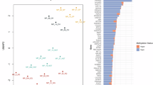 Given that MBCs of distinct histologic subtypes have been reported to display different gene expression profiles5 and mutational repertoires9, we performed an exploratory analysis to define whether the histologic diversity would be underpinned by distinct patterns of gene CNAs. Hierarchical clustering of the categorical CNA states revealed that the three MBC histologic subtypes did not form distinct clusters (Fig. 2a). We observed, however, two stable clusters, one composed predominantly of MBCs with squamous differentiation (cluster 2, consisting of META37, META40, META53, and META62), and the other composed mainly of MBCs with mesenchymal differentiation (chondroid or spindle cell differentiation; cluster 1, consisting of all other samples), with a significant enrichment of MBCs with squamous differentiation in cluster 2 (p-value = 0.004, Fisher’s exact test). The clusters differed predominantly by gains of 1p and losses of chromosome 2 and 9q (Fig. 2b, Supplementary Table 5). Indeed, direct comparisons between the distinct histologic MBC subtypes revealed that MBCs with squamous differentiation had higher fractions of the genome altered compared to non-squamous MBCs (p-value = 0.02, Mann–Whitney U test, Supplementary Fig. 3), but few CNAs were significantly different between them. MBCs with chondroid differentiation were characterized by 21q11.2 gains and high level gain/ amplification of 8q21.11-24.3 compared to non-chondroid MBCs (both p-value < 0.05, Fisher’s exact tests, Supplementary Fig. 3a, Supplementary Table 6). MBCs with spindle cells harbored similar frequencies of gene CNAs as MBCs with squamous or chondroid differentiation, apart from the less frequently observed 7q11.22-23 gain encompassing CLDN3 and CLDN4 (p-value < 0.05, Fisher’s exact test, Supplementary Fig. 3b, Supplementary Table 7 ). Compared to MBCs with spindle cell or chondroid differentiation, MBCs with squamous differentiation infrequently harbored amplification/ high-level gain of 8q24, but harbored more frequent losses on 7q and 12q and gains on 11p and 12q (all p-value < 0.05, Fisher’s exact tests, Supplementary Fig. 3c–d, Supplementary Table 8). Furthermore, we noticed that two cases harbored very few or no CNAs (META36 and META47). The tumor cell content for META36, a chondroid MBC, was estimated to be 87 and 80% by ABSOLUTE and pathology review, respectively, whereas META47, a spindle cell MBC, did not harbor any CNA and its tumor cell content was estimated to be 70% by pathology review but could not be estimated by ABSOLUTE (Supplementary Table 1). It should be noted, however, that META47 was classified as claudin-low, as opposed to normal breast-like, based on intrinsic subtyping.5 These analyses support the contention that the lack of CNAs was not a result of insufficient tumor cell content. In fact, gene copy number analysis of the samples of the METABRIC study has revealed the existence of a subset of TNBCs lacking CNAs despite the adequate tumor cell content.18