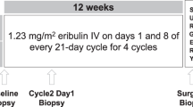 The evaluation of TILs has been shown to represent a reliable surrogate of the immune anti-tumour activity and a robust independent prognostic biomarker in breast cancer patients, especially in the TNBC and HER2-positive breast cancer subtypes30,31. Retrospective reports analysed TILs as prognostic and predictive markers in metastatic TNBC patients that received eribulin32. In a previous analysis, the high TILs group vs low TILs within the metastatic TNBC cases had better outcomes and suggested TILs to predict treatment response to eribulin in the TNBC metastatic setting32. In our early stage breast cancer cohort, stromal TILs detected in H&E slides were more frequent in basal-like primary tumours. A statistically significant higher percentage of stromal TILs after the end of neoadjuvant therapy was not observed possibly due to the small sample size and other biological factors including immunosuppressive TME. However, we observed an enrichment in pathways associated with immune infiltration and reduced programmed cell death after 12 weeks of eribulin administration corroborating findings observed in metastatic breast cancer. In a recent study33, lymphocyte infiltration increase and PDL1 expression turning to negative values were suggested to be improvements in the immunosuppressed TME of patients receiving eribulin for advanced breast cancer. Our findings add to current evidence for potentially combining checkpoint inhibitors to eribulin in the early breast cancer setting34.