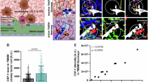 After mice were sacrificed, all mammary tumors were extracted and immersed in 10% formalin in a volume ratio of tumor to formalin of 1:7. Tissues were fixed for 24 to 48 h and embedded in paraffin, then processed for histological examination. One 5 µm section from each tumor was stained for hematoxylin and eosin (H&E) and one for TMEM. The TMEM doorway assay is a triple-stain IHC for predicting metastatic risk, in which three antibodies are applied sequentially and developed separately with different chromogens on a Dako Autostainer. TMEM doorway stain was performed as previously described2, except that in this study we used anti-panMena antibody (510693; BD Biosciences) to detect Mena-expressing cancer cells. To visualize macrophages, we used anti-IBA1 antibody (019-19741; Wako) for mouse and anti-CD68 (MO876; Dako) for human tumors. To visualize endothelial cells, we used anti-endomucin (SC-65495; Santa Cruz) for mouse and anti-CD31 (MO823; Dako) for human tumors. Appropriate areas containing invasive cancer tissue suitable for TMEM doorway analysis were identified by low-power scanning using the following criteria: high density of tumor, adequacy of a tumor, lack of necrosis or inflammation, and lack of artifacts such as retraction or folds. TMEM doorway scoring was performed as previously described2,36. The assessment of TMEM doorway scores was performed with Adobe Photoshop on ten high-power (400X) digital images of the most representative areas of the tumor. The total number of TMEM doorways for each image were tabulated, and the scores from all ten images were summed to give a final TMEM doorway density for each patient sample, expressed as the number of TMEM doorways per total area (ten high-power [400X] fields). A representative high-power magnification image showing the tripartite TMEM doorway is indicated in Supplementary fig. 3a. IBA1 single immunohistochemistry was performed with the IBA1 primary antibody used in the TMEM immunohistochemistry, and a representative high-power magnification image is indicated in Supplementary fig. 3b.