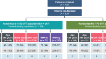 Patient baseline characteristics were well-balanced between arms (Table 1). The median age was 54 (range 27–82), the median number of prior anticancer regimens (any setting) was 4 (range 2–17), and all patients had previously received a taxane. There were 49 (19%) and 48 (21%) patients aged ≥65 years in the SG and TPC arms, respectively; of these, 8 and 13 patients were aged ≥75 years.