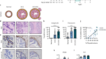 Epithelial β6 integrin has been implicated as a driver of progression in cancer, with its expression associated with an aggressive tumour phenotype and reduced survival48,52,53,54,55,56. However, these studies mostly describe an upregulation of β6 in cancer cells, opposed to expression in other epithelial derived cells of the tumour microenvironment, such as myoepithelial cells. Here, we present a 3D spheroid model incorporating β6-inducible myoepithelial cells with breast luminal cells in a physiologically relevant matrix, enabling the myoepithelial mechanisms that underpin early-stage breast cancer progression to be dissected. 3D models of the tumour microenvironment are an excellent tool to dissect cellular crosstalk and are becoming a key component of a researcher’s toolkit57. Our heterocellular model system offers a unique advantage over others, such as the MCF10A cell line model, which has the capacity to form spheroids but tends to adopt a mixture of both luminal and myoepithelial characteristics58,59. Critically, our model allows for the manipulation of distinct myoepithelial and luminal compartments, while maintaining their cellular phenotypes, to recapitulate behaviour seen in human breast tumours. We show that upregulation of the high-risk DCIS marker β6 integrin, in the myoepithelial compartment, drives myoepithelial-led invasion of luminal cells in our spheroid models. As luminal cells are unable to invade in the absence of a myoepithelial conduit (Supplementary Fig. 1f), this suggests that during the early stages of invasion, β6-expressing myoepithelial cells may adopt characteristics similar to those of cancer-associated fibroblasts. This phenomenon is frequently observed during stromal-led invasion, where invading cancer cells maintain their epithelial phenotype and exploit non-malignant cells of the microenvironment to pave the way for invasion34,60. Interestingly, in a model of murine breast cancer invasion, leading cells have been shown to adopt the basal CK14 + characteristics of myoepithelial cells35. However, as our model incorporates a myoepithelial cell compartment, this provides evidence that cancer cells can rely on resident myoepithelial cells, and thus maintain their luminal state during invasion. A key advantage of our hanging drop spheroid approach is its tractability, but it lacks the intact myoepithelium present in our primary cell model of ductal bilayer development31. Therefore, we importantly confirmed that all our key findings were recapitulated in this approach, where an intact myoepithelium is present from 14 days of culture.