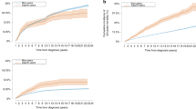 We used multivariable Cox proportional hazards regression to estimate hazard ratios (HRs) and 95% confidence intervals (CIs) for the prospective associations between post-diagnostic aspirin use, updated every 2 years, and breast cancer-specific and all-cause mortality. We used the time since diagnosis as the time scale to account for left truncation due to variations between participants in the timing of post-diagnostic assessment43,44. The Anderson–Gill data structure was used to handle time-varying exposure and covariates, updated 2 years. We started follow-up from the return date of the first post-diagnostic questionnaire. To avoid short-term changes in medication use during active treatment, we defined the first post-diagnostic aspirin use as aspirin reported on the first questionnaire collected ≥12 months after diagnosis45. Participants were followed until death or the end of follow-up (June 1, 2019), whichever came first. In each model, we adjusted for time-invariant covariates of age at diagnosis, calendar year of diagnosis, stage, treatment, pre-diagnostic BMI, oral contraceptive use, menopausal hormone use, parity, menopausal status, and ER status; and time-varying covariates updated every two years of change in BMI from pre- to post-diagnosis, post-diagnostic physical, post-diagnostic smoking, post-diagnostic nSES. We stratified all models by cohort and follow-up period. The proportional hazards assumption was tested by assessing the interaction term between aspirin exposure and time within each 2-year follow-up interval. No violation of the proportional hazards assumption was noted. To minimize population differences between regular and non-regular aspirin users, we computed a propensity score by estimating the probability of regular use of aspirin based on age, BMI, physical activity, nSES, and history of angina, myocardial infarction, stroke, or rheumatoid arthritis. As a sensitivity analysis, we further adjusted for the use of beta-blockers, statins and other non-steroidal anti-inflammatory drug (NSAIDs). To better approach the parameters of the trials, we modeled the relation between post-diagnostic regular aspirin use and mortality stratified by time since diagnosis and assessed whether total duration (pre- and post-diagnostic) and post-diagnostic duration of aspirin use were associated with mortality. We performed stratified analyses by participant, clinical, and tumor characteristics. As a sensitivity analysis, we used Fine and Gray sub-distribution hazards to account for competing risks when modeling breast cancer-specific mortality, with competing events defined as death due to all other causes.