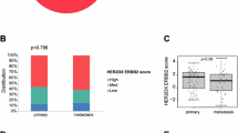 Furthermore, we performed ROC analysis using ERBB2 expression as the predictor and IHC-based HER2 classification as the reference (HER2-low being samples with IHC score of 1+ or 2+ with negative in situ hybridization and HER2-zero being samples with IHC score of 017) (Supplementary Fig. 2). The AUC values were ≥0.75 for both RNA-Seq and microarray datasets, indicating strong performance. Nonetheless, our study aims to establish an expression-based approach to classifying breast tumors, aligning more closely with the definitions of HER2-low and HER2-zero in Tarantino et al.18. In this context, while our “very low” class is not exclusive to IHC = 0 (Fig. 1B) and includes samples with minimal HER2 expression, we consider it equivalent to HER2-zero. Similarly, our ‘low’ class corresponds to HER2-low. Given this distinction, despite previous IHC-based studies reporting higher proportions of HER2-low status among ER-positive breast cancers19, our analysis finds transcriptomics-defined HER2-low to be more prevalent in ER-negative disease (Supplementary Figure 3).