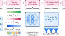 According to Villars,33 the EPs used in machine-learning of intermetallics can be classified into five main groups related to atomic number, atomic size, electrochemical properties, valence electron properties, and cohesive energy properties. The EPs chosen for this work included one or more EPs from each of these five groups. Among these, we note that Mooser and Pearson used n av (the average of principle quantum numbers) and ΔX (difference in Pauling electronegativities) to evaluate the structural stability,30 and Miedema et al.31 developed \(\Delta {n}_{WS}^{\mathrm{1/3}}\) (difference in the cube roots of the electron densities at the Wigner–Seitz cell boundary) to predict the heat of formation. In addition to the EPs, we also considered a few CPs, such as alloy density, volume, and formation energy, which are simple to evaluate based on DFT calculations.