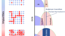 As a first example, the conduction band of CdTe is centered directly at Γ (N v = 1) and has a spherical Fermi surface (as shown in Fig. 1d). This simple band structure shows the effective masses (\({m}_{{\rm{S}}}^{\ast }\) and \({m}_{{\rm{c}}}^{\ast }\)) as computed from calculated Boltztrap data (shown in Fig. 1 as described earlier) are constant with varying doping (Fermi level) and roughly consistent with experimental and traditionally calculated values of m*.43 The Fermi surface complexity factor \(({N}_{{\rm{v}}}^{\ast }{K}^{\ast })\) also shown in Fig. 1c is very close to 1 for the conduction band, consistent with a single (\({N}_{{\rm{v}}}^{\ast }\) = 1) spherical pocket (K * = 1). The computed \({N}_{{\rm{v}}}^{\ast }{K}^{\ast }\) is approximately 1 over a wide range of Fermi levels even as the Fermi level is moved deeper into the Γ band. A slight decrease in value and increase in noise is observed as the Fermi level moves farther into the band presumably due to sensitivity of \({m}_{{\rm{S}}}^{\ast }\) to the small variations in Seebeck at these Fermi levels.
