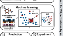 Figure 2 shows the results of a compatibility test for the ordering of superstructures of a number of double perovskites with chemical formula AA′BB′C3\({\mathrm{C}}_3^\prime\). Here, A/A′-site cations are either rare earths or actinides, B/B′ cations are transition metal elements, and C/C′ anions are mostly oxygen or halogens. Using the ionic radii28,29 of the two existing single perovskites ABC3 and A′B′\({\mathrm{C}}_3^\prime\) (see the inset in Fig. 2b), we assess the geometric stability of a possible double perovskite AA′BB′C3\({\mathrm{C}}_3^\prime\) by calculating the Goldschmidt tolerance factor,27,30 \(t\) = \({\textstyle{{r_A + r_C} \over {\sqrt 2 \left( {r_B + r_C} \right)}}}\), where rA, rB, and rC are the average ionic radii of (A, A′), (B, B′), and (C, C′), respectively; here, we have neglected other contributing factors such as the effects of octahedral tilting. We considered both ordered and disordered compounds on B and B′ sites, and following the method described by Vasala et al.,30 we treat all compounds with the same chemical formulae regardless of the ordering at the B-sites. Note that Goldschmidt tolerance factor is a good measure for testing the stability of AA′BB′C3\({\mathrm{C}}_3^\prime\) type perovskite compounds, where B or B′-site cations can be ordered or disordered.30 Considering each data point as a paired combination of a double-perovskite superstructure, we plot the associated tolerance factor t and the lattice-parameter-ratios \({\textstyle{{a1} \over {a2}}}\) and \({\textstyle{{c1} \over {c2}}}\) in Fig. 2a, where (a1, c1) and (a2, c2) are lattice parameters of ABC3 and A′B′\({\mathrm{C}}_3^\prime\) perovskites, respectively. Clustering of the data in Fig. 2a reflects the correlation between the type of anion/cation involved and the space group of the individual perovskites with the tolerance and lattice parameters. High tolerance factors can be achieved when \({\textstyle{{a1} \over {a2}}}\) and \({\textstyle{{c1} \over {c2}}}\) are close to unity, i.e., when the difference in ionic radii of A (rA − rA′) or B (rB − rB′) site cations is small. We also see the important role of space groups here such as two cubic perovskites usually result in a stable double perovskite in contrast to the cases where the space groups are mixed. This is to be expected because similar crystal structures of the two contributing perovskites lead to lesser cation size mismatch or smaller differences in ionic radii of the cations of individual sites and result in higher tolerance factors. This is why we would expect the most abundant double-perovskite systems to be formed from two cubic systems, as demonstrated in Fig. 2b. We see a linear trend in Fig. 2b where the data points are plotted in the \({\textstyle{{a1} \over {a2}}}\) and \({\textstyle{{c1} \over {c2}}}\) plane. The central line indicates that the most abundant double-perovskite systems would be formed from ABC3 and A′B′\({\mathrm{C}}_3^\prime\) cubic systems. Other trend lines in Fig. 2b show the cases in which mixed systems can be formed from cubic and other (non-cubic) crystal structures. For this reason, we allowed a mixture of anions to identify various possibilities in the stability trend lines. We generally see the trend of high stability (t) when both C and C′ anions are oxygen or hydrogen compared to the case when both anions are halogens (see Fig. 2a). This indicates that the most stable structures are formed when both anions are identical, which should be contrasted with the situation where anions are allowed to mix. In this way, we were able to cluster possible candidate perovskites with respect to anion mixing and distinguish them in terms of their stability.