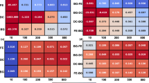 We build GPR models to predict (i) the band gap, (ii) the VBM and CBM dispersion curves, and (iii) the thermoelectric EFF curve as a function of carrier-dopant concentration for both n-type- and p-type-doped hetero-structures. In the case of predicting the band gap, the target variable Y is a scalar, whereas in the case of predicting the VBM, CBM, and EFF curves, the target variable \(\vec Y\) is made into a vector by discretizing a continuous curve into discrete points. A different model is trained for each point in order to create a predicted curve. Training each model involves calculating a percentage (in our case, ranging from 40% to 70%) of the entire class of three-layered hetero-structures, which are randomly selected to serve as each regression model’s training set. The remaining structures, which the regression model has never encountered, are used as the test data set. Each model is then tasked with predicting its respective target variable (band gap, discrete points in the VBM, CBM, and EFF curves) for all structures in the test data set. Details of the GPR model may be found in the Methods section.