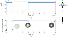 Here, \({\overrightarrow{m}}_{i}\) is the unit vector in the direction of the magnetic moment at lattice site i; J, and D are the parameters of Heisenberg exchange and DM interaction between nearest-neighbor spins, respectively. The unit DM vector \({\overrightarrow{d}}_{ij}\) lies in the monolayer plane and points perpendicular to the bond connecting sites i and j. The model also includes out-of-plane anisotropy with the easy axis defined by the unit vector \({\overrightarrow{e}}_{K}\) pointing perpendicular to the monolayer plane and effective parameter K incorporating both magnetocrystalline and magnetostatic contributions70. Effective treatment of the stray fields in the context of skyrmion stability is justified for thin films27, but may fail as the film thickness increases.