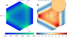 To describe the symmetry-related character of the Bloch electron, we calculate the Berry curvature Ω(k), which can be obtained from the overlap matrix of the Kohn-Sham orbitals, as\(\Omega _{\mathrm{n}}\left( {\boldsymbol{k}} \right) = \nabla \times {\mathbf{A}}_{n{\boldsymbol{k}}}\), where \({\mathbf{A}}_{n{\mathbf{k}}} = - {\mathrm{i}}\left\langle {u_{n{\boldsymbol{k}}}{\mathrm{|}}\frac{\partial }{{\partial {\boldsymbol{k}}}}{\mathrm{|}}u_{n{\boldsymbol{k}}}} \right\rangle\) and \(\left| {\mathop {\mu }\nolimits_{nk} } \right\rangle\) is a normalized wave function. The k-resolved Berry curvature Ω(k) integrated over the whole valence band of C2 is shown in Fig. 4a. Externally introduced exchange splitting without lattice deformation results in Ω(k) = Ω(−k) because of the preservation of inversion symmetry3,39,40. In contrast, the Berry curvature observed here has two opposite peaks at the BZ corners (K and K′) in C2. This can be attributed to the remarkable relationship of Dirac fermions to sublattice polarization and inversion symmetry breaking caused by mechanical deformation. Blister induced deformation and local symmetry modification cause a pronounced PMF, even in the vicinity far beyond the blister region because of long-range rippling. Similar phenomena have been predicted in previous theoretical works41,42. Here the C2 system loses its spatial inversion, but the local structure and bands related to the VHS have preserved threefold symmetry. The reduction of sixfold to threefold symmetry creates equal and opposite distinguishable chiral valleys at K and K′. It should be noted that the absence of spatial and time inversion symmetry should provoke a valley polarization state. However, due to the insignificant SOC strength of carbon atoms, no tangible valley polarization is observed in Ω(k). The out-of-plane magnetization shows no substantial change in the Sz spin component throughout the BZ (not shown here). Nonetheless, the in-plane spin textures (Sxy) for both the valence band maxima (VBM) and conduction band minima (CBM) show chirality, as shown in Fig. 4b, c. The VBM has a clockwise and counter-clockwise spin texture around K (K′), which matches well with the threefold symmetry of the Berry curvature at K (K′). Furthermore, the valley polarization is quite visible in the Sxy vector field of the VBM and CBM because the in-plane spin field is different at K compared with K′. The anomalous Hall conductivity (AHC) can be defined as \(\sigma _{xy}^{{\mathrm{AHC}}} = \frac{{{\mathrm{e}}^2}}{{2\pi \,h}}{\int_{BZ}} {\Omega ({\mathbf{k}}){\mathrm{d}}{\mathbf{k}}_{\mathbf{x}}{\mathrm{d}}{\mathbf{k}}_{\mathbf{y}}}\), where kx and ky are BZ vectors. Therefore, in the absence of valley polarization Ω(k) = −Ω(−k), and the total AHC \(\sigma _{xy}^{{\mathrm{AHC}}} = \sigma _{xy}^K + \sigma _{xy}^K\) is zero. The so-called valley Hall conductivity can be defined as\(\sigma _{{\it{xy}}}^{{\mathrm{VHC}}} = \frac{{{\mathrm{e}}^{\mathrm{2}}}}{{{\mathrm{2}}\pi \,{\mathrm{h}}}}{\int_{{\mathrm{k}}/k^{\prime}}} {\Omega ({\mathbf{k}}){\mathrm{d}}{\mathbf{k}}_{\mathrm{x}}{\mathrm{d}}{\mathbf{k}}_{\mathrm{y}}}\) at the two valley points K(K′). Because of exchange splitting, we obtain a value of 1/2(−1/2) in the unit of \(\frac{{{\mathrm{e}}^2}}{h}\), which confirms VHE in C2. Consequently, the electrons from both valleys are deflected to opposite edges, and the contributions to the AHC from the individual valleys \(\sigma _{xy}^{{\mathrm{AHC}}} \ne\) 0. A similar case was also discussed previously with the Fermi-level locating in the band gap43. The spin polarization in C2 gives rise to large exchange splitting and spin-filtered VH states can be observed, where all the current-carrying edge states have the same spin orientation. Thus, this C2 blister system also presents the spin-filtered Hall Effect, as shown in Fig. 4d. Moreover, the spin-filtered VH states are protected against the slight movement of the Fermi level caused by exchange splitting. To extract the graphene character in C2, we also calculate the Berry curvatures by integrating over the graphene valence bands (impurity bands near the Fermi level are excluded). In contrast with pristine graphene, the Berry curvatures of the valence bands without impurity bands also show a chiral character Ω(K) = −Ω(K′) (see Supplementary Fig. 4), which makes it a robust candidate for practical valleytronics devices.