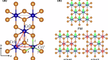 These band-structure renormalizations have non-trivial effects to the microscopic exchange interactions, which we depict in Fig. 4 (bottom panel) and which can be just partially understood within the KK formalism. In line with KK a reduction of U or \(U^{\prime}\) yields an enhancement of the AFM Jt2g–t2g channel, as shown in the ΔU and \({{\Delta }}U^{\prime}\) columns of Fig. 4 (bottom panel), while modifications to JH do not affect Jt2g–t2g at all. Also in qualitative agreement with KK we find that a reduction of JH reduces the FM Jt2g–eg. In contrast to the simple model predictions from KK we find from MFT that Jt2g–t2g is slightly reduced upon reducing U while modifications to \(U^{\prime}\) yields no modifications. This underlines the need for the full microscopic MFT in combination with an extended basis to quantitatively understand magnetism in CrI3. We expect that just an extended model combining the super-exchange mechanism from the Goodenough-Kanamori description and the multi-orbital KK mechanism might yield a qualitatively understanding in line with our MFT findings, which will be studied separately. Here, we conclude that the extended (d + p)-basis together with the corresponding cRPA Coulomb matrix elements and using an HF solver results in a reliable band-structure and microscopically correct magnetic properties.