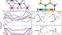 The enhanced valley splitting in heterostructures may be understood in terms of an MPE. This can be seen in Table 2, which shows that for both K and K′, EVB decreases, but ECB is nearly a constant, with an increasing θ. One may note that both the VB and CB states of WSe2 are made of predominantly W d orbitals: \(d_{{{{\mathrm{x}}}}^2 - {{{\mathrm{y}}}}^2/{{{\mathrm{xy}}}}}\) for VB, and \(d_{{{{\mathrm{z}}}}^2}\) for CB. Figure 5a–d shows the differences in the partial charge density Δρ of the valence band maximum (VBM) states at K and K′. An obvious θ-dependence of Δρ is observed near Cr atoms. Figure 5e shows the planar averaged Δρ along z, \(\overline {{{{\mathrm{{\Delta}}}}}\rho } (z)\). It reveals how the states of WSe2 is affected by the proximity of Cr atoms inside CrI3. This analysis suggests that the VBM states are responsible for the enhanced valley splitting. Indeed, results in Table 2 support such a conclusion as it shows that valley splitting is mainly a result of a θ-dependent ΔVB.