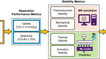 Surface area was geometrically calculated by rolling a nitrogen-sized (σ = 3.71 Å) spherical probe on MOF atoms. The surface area corresponded to the area of the surface traced by the center of the probe82. Void fractions were calculated using the Widom insertion method with a helium atom as probe (σ = 2.64 Å, ε/K = 10.9)83. Largest and limiting pore diameters (LPD and PLD, respectively) were calculated using Zeo++ (version 0.2.2)84.
